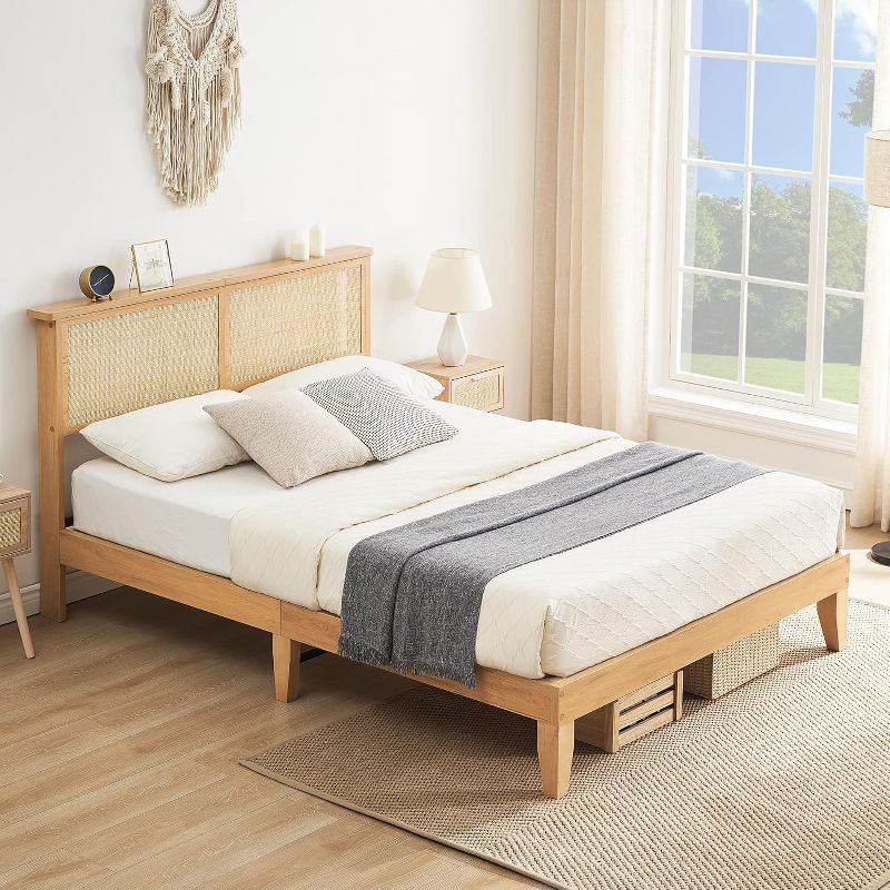 Solid Wood Bed Frame with Natural Rattan Headboard – Queen Size Platform Bed