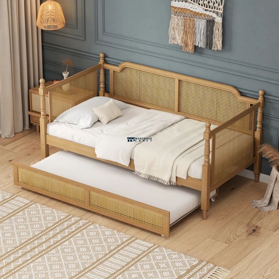 This Solid Wood Cane Daybed with Trundle is a perfect blend of timeless craftsmanship and modern functionality. Designed with beautifully handwoven natural cane panels on the backrest, sides, and trundle front, it adds warmth and elegance to any bedroom or living space. The pull-out trundle bed makes it an ideal solution for guest rooms, kids’ rooms, or compact homes, offering extra sleeping space without compromising on style.