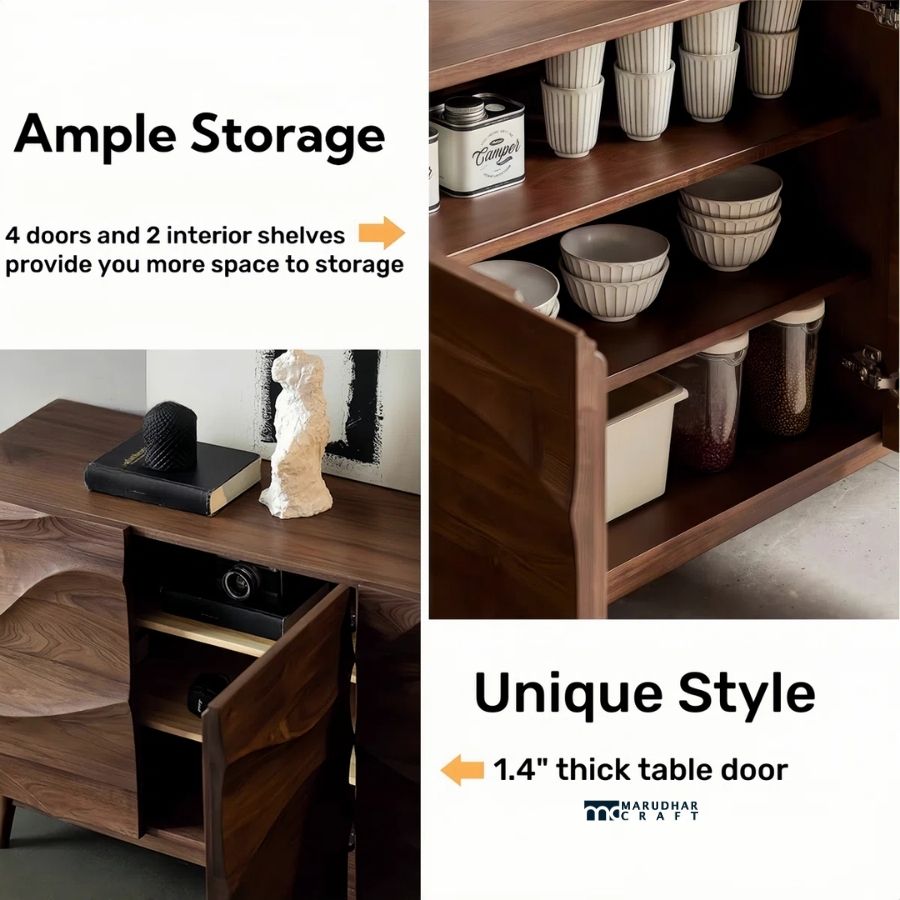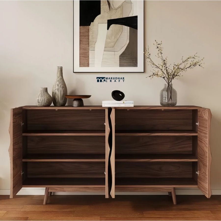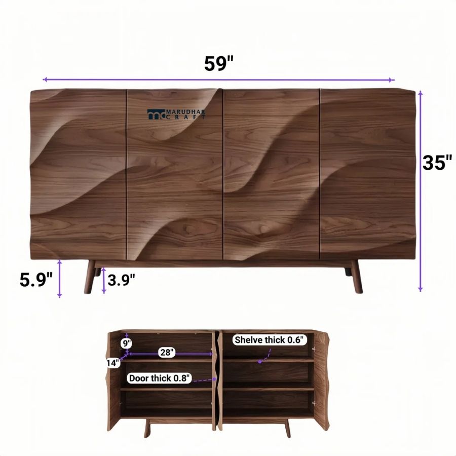 Make a bold style statement in your living or dining space with this designer solid wood sideboard cabinet. Featuring a beautifully carved wave-pattern front, this cabinet showcases expert craftsmanship and natural wood grain in a rich walnut finish. Its clean, handle-less design offers a modern, artistic look while keeping your space clutter-free.