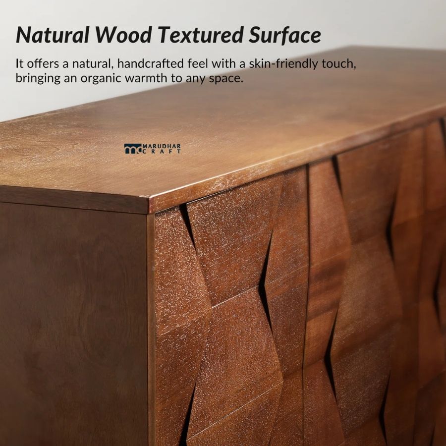 Add a bold, modern statement to your living room with this solid wood designer sideboard, featuring an eye-catching geometric front pattern. Crafted with precision, the cabinet highlights rich natural wood grain in a warm walnut finish, bringing depth and sophistication to your interiors. Its clean-lined silhouette and angled legs add a contemporary mid-century touch.