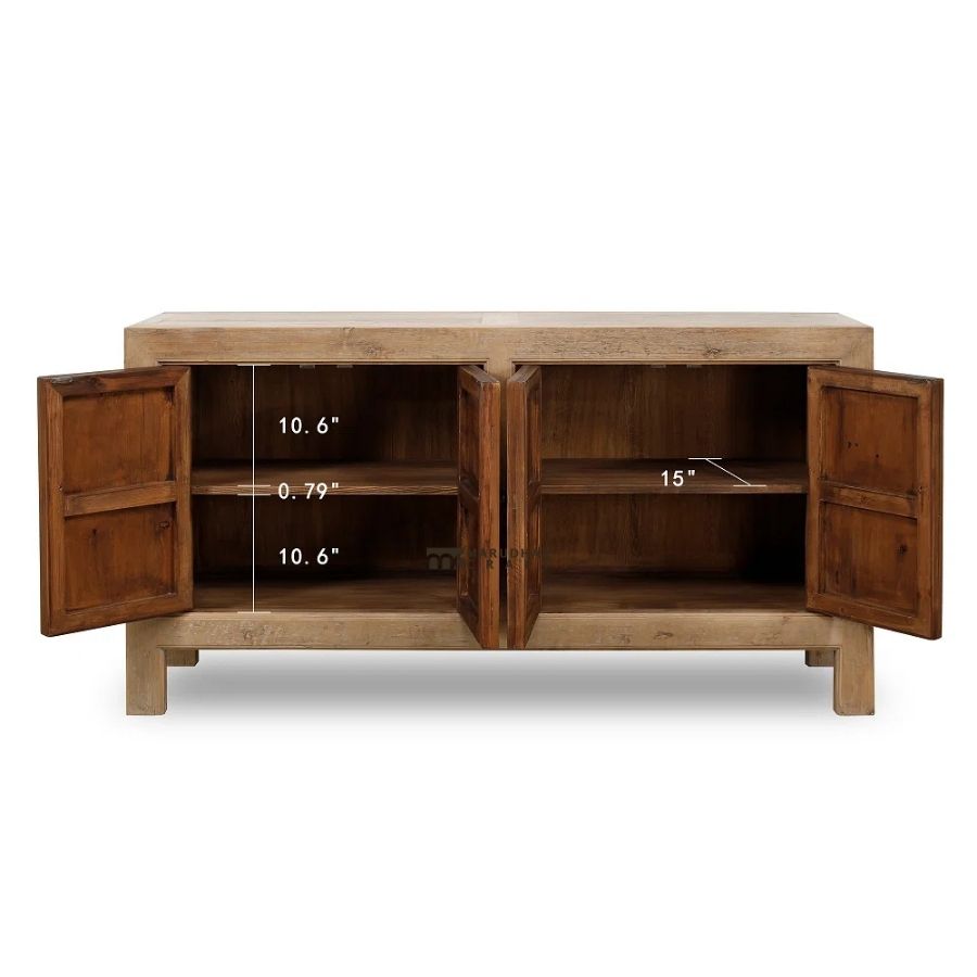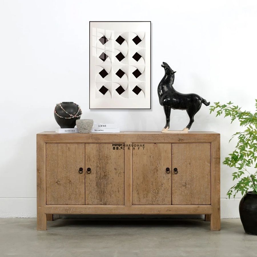 Solid Wood Sideboard Cabinet with Distressed Finish – Rustic Natural Wood
