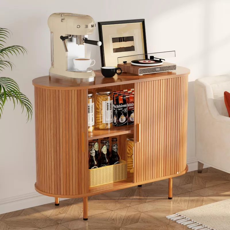 This solid wood–style sideboard with tambour sliding doors offers a perfect blend of modern design and functional storage. Featuring smooth sliding doors and a clean, compact profile, it provides organized storage without taking up excess space. Crafted from durable MDF, this sideboard is ideal for living rooms, dining areas, bedrooms, or entryways where both style and practicality are important.