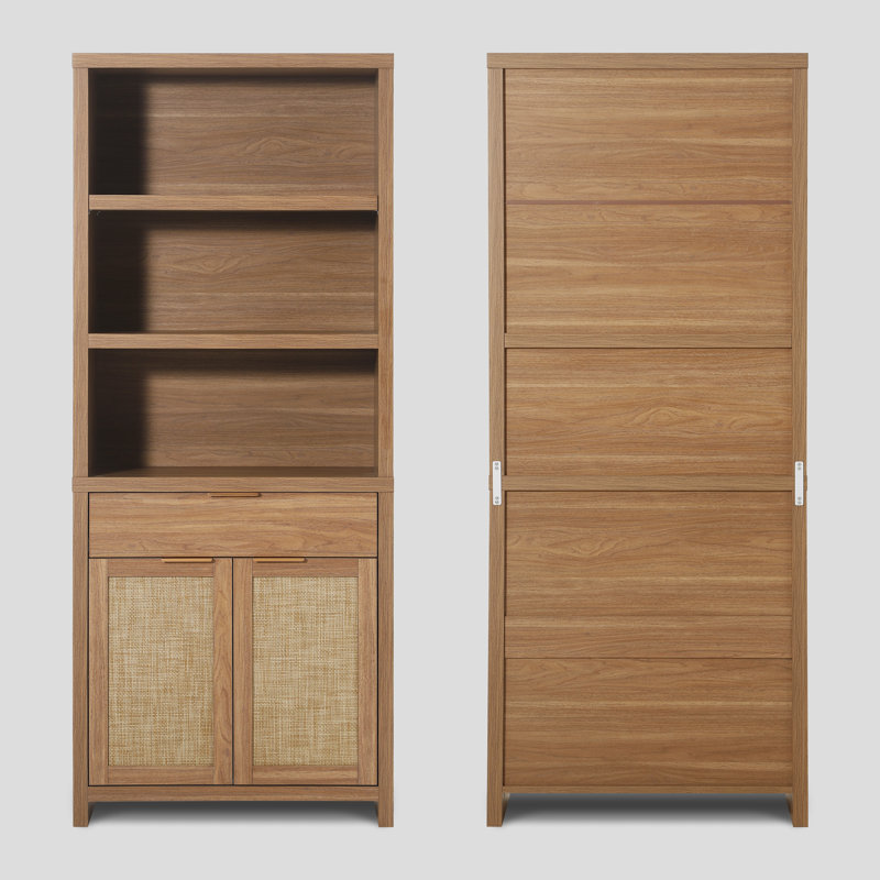 It features open adjustable shelves for books and décor, along with drawers and cabinet doors for concealed storage. This design helps keep your space neat, organized, and stylish.