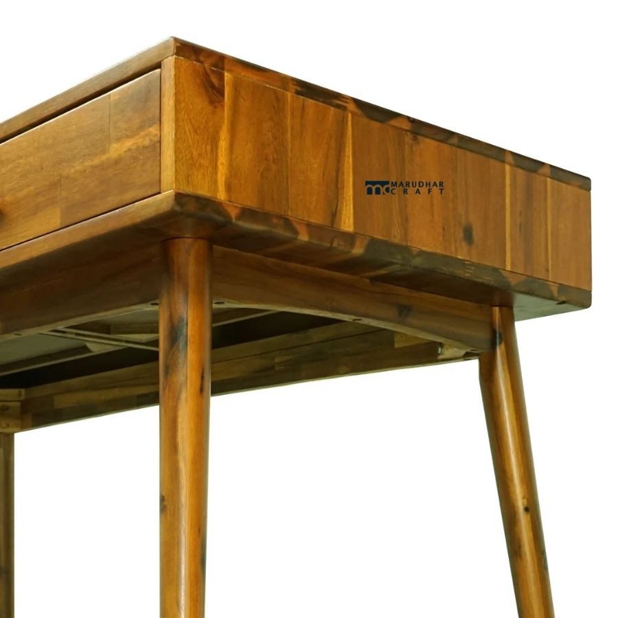Add warmth and sophistication to your workspace with this beautifully crafted solid wood writing desk. Designed with a sleek profile and tapered wooden legs, this table perfectly balances modern style with everyday functionality. The spacious tabletop is ideal for writing, laptop work, or décor display, while the two smooth-glide drawers provide convenient storage for stationery and personal essentials. Its rich natural wood finish makes it suitable for study rooms, home offices, or even as a stylish console table.