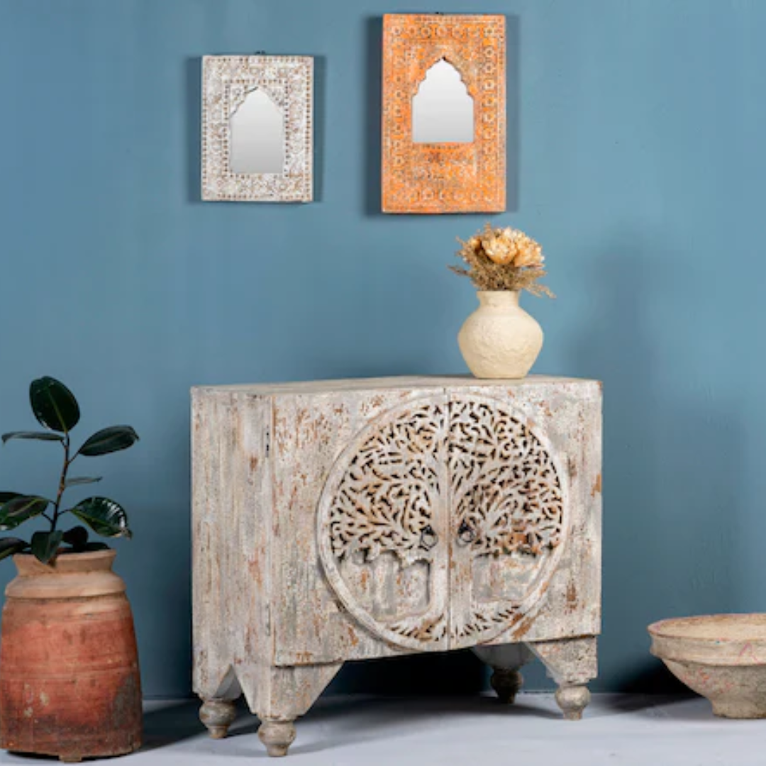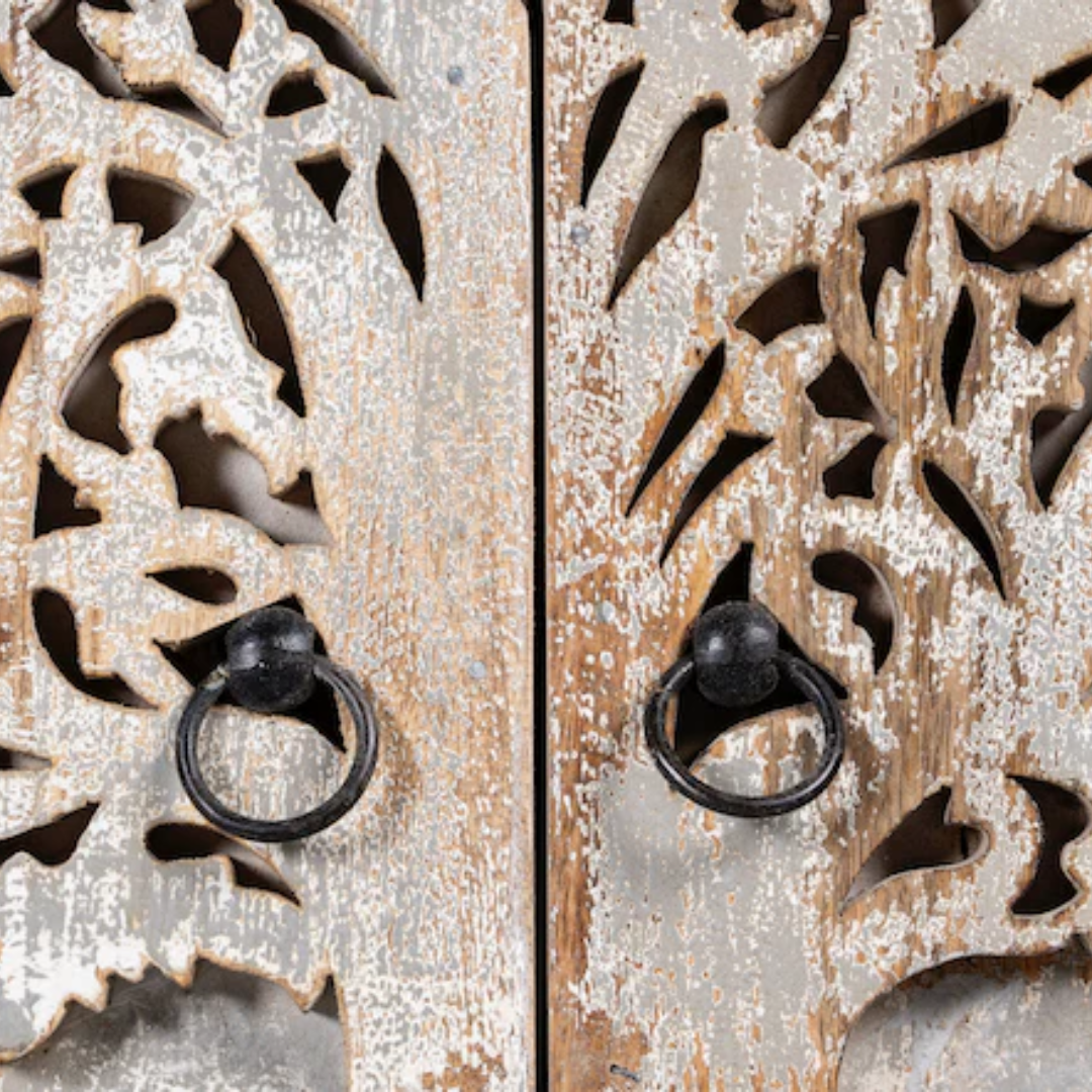Discover the elegance and beauty of our mango wood cupboard Rajouri adorned with intricate hand-carved tree designs on the entire front surface. Each detail has been lovingly crafted to provide rich visual texture and a sense of artisanal craftsmanship.