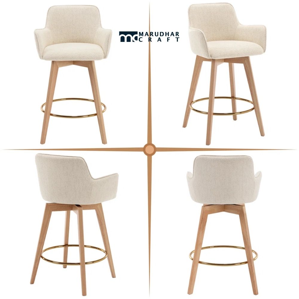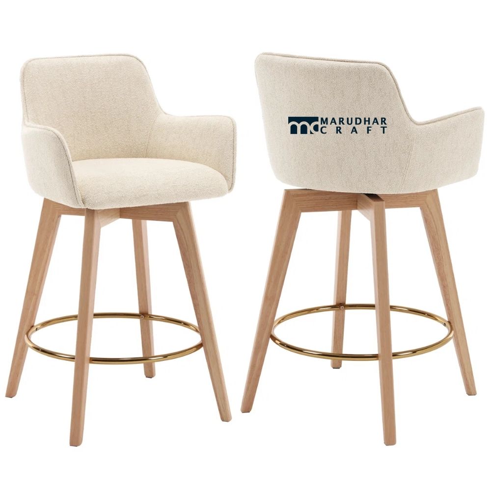 The smooth 360-degree swivel function allows easy movement without shifting the stool, making conversations and serving effortless. Upholstered in soft, cushioned fabric, the seat offers exceptional comfort, while the solid rubberwood frame provides lasting durability. The gold-finished footrest adds a touch of sophistication, giving your space a refined modern look.