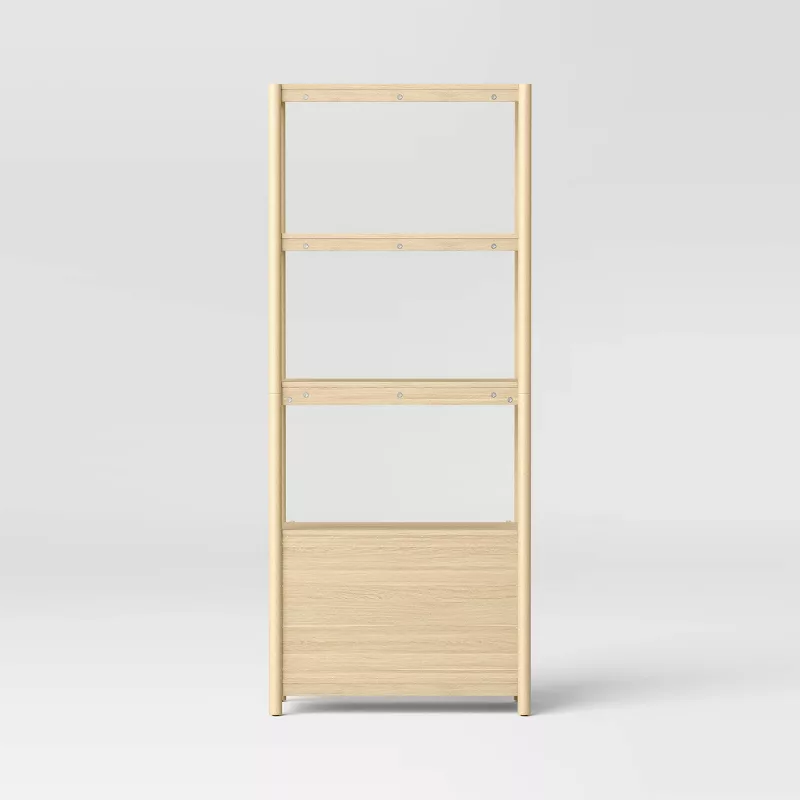 Enhance your home with this elegant tall bookcase featuring three open shelves and a lower storage cabinet. Designed in a natural wood finish, this piece adds warmth and functionality to any room. The open shelves are perfect for displaying books, photo frames, plants, and décor, while the cabinet below provides concealed storage for keeping your space neat and organized.