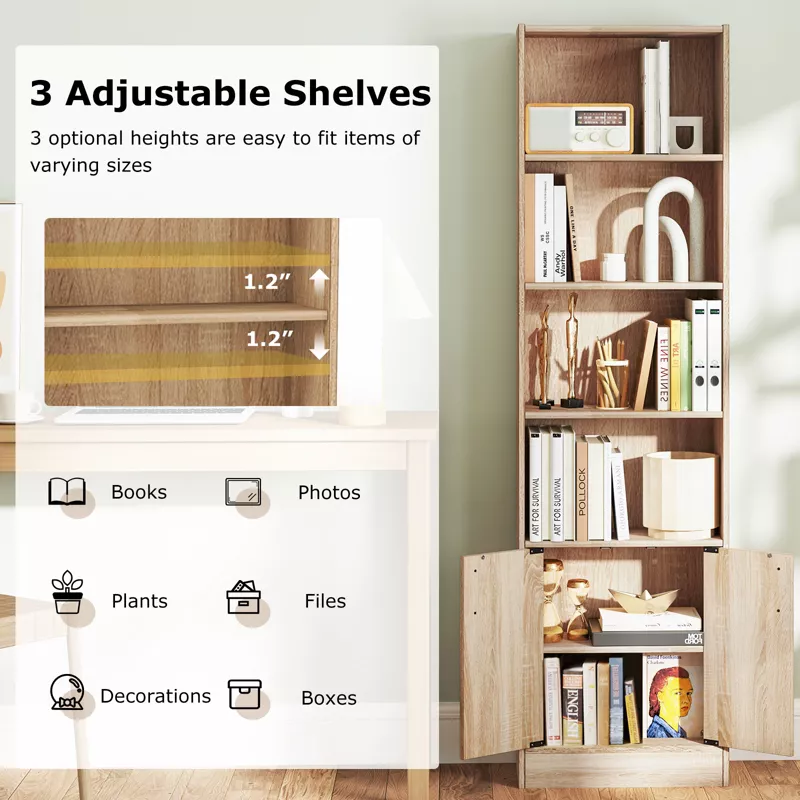 This versatile bookcase includes open shelves for displaying books, plants, décor, and photo frames, along with a spacious lower cabinet for storing larger or private items. Built from thick particle board with a stable base and non-slip foot pads, it offers excellent durability and stability. The included anti-toppling devices ensure added safety, making it ideal for family homes, offices, and apartments.