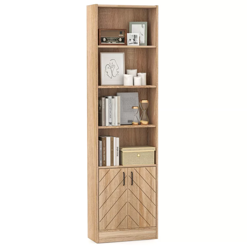 Enhance your home with this tall wooden bookcase designed for both style and functionality. Featuring a vertical strip pattern and rich oak wood-grain finish, this elegant storage cabinet brings warmth and sophistication to any living space. Its slim, vertical design makes it perfect for rooms where you want maximum storage without sacrificing floor space.