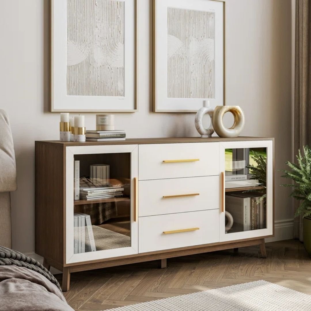 - Stylish Sideboard – Blends white accents with a warm wood grain finish and gleaming gold-toned metal handles for an elegant look. Tapered legs give this wood buffet sideboard a trendy mid-century modern touch.