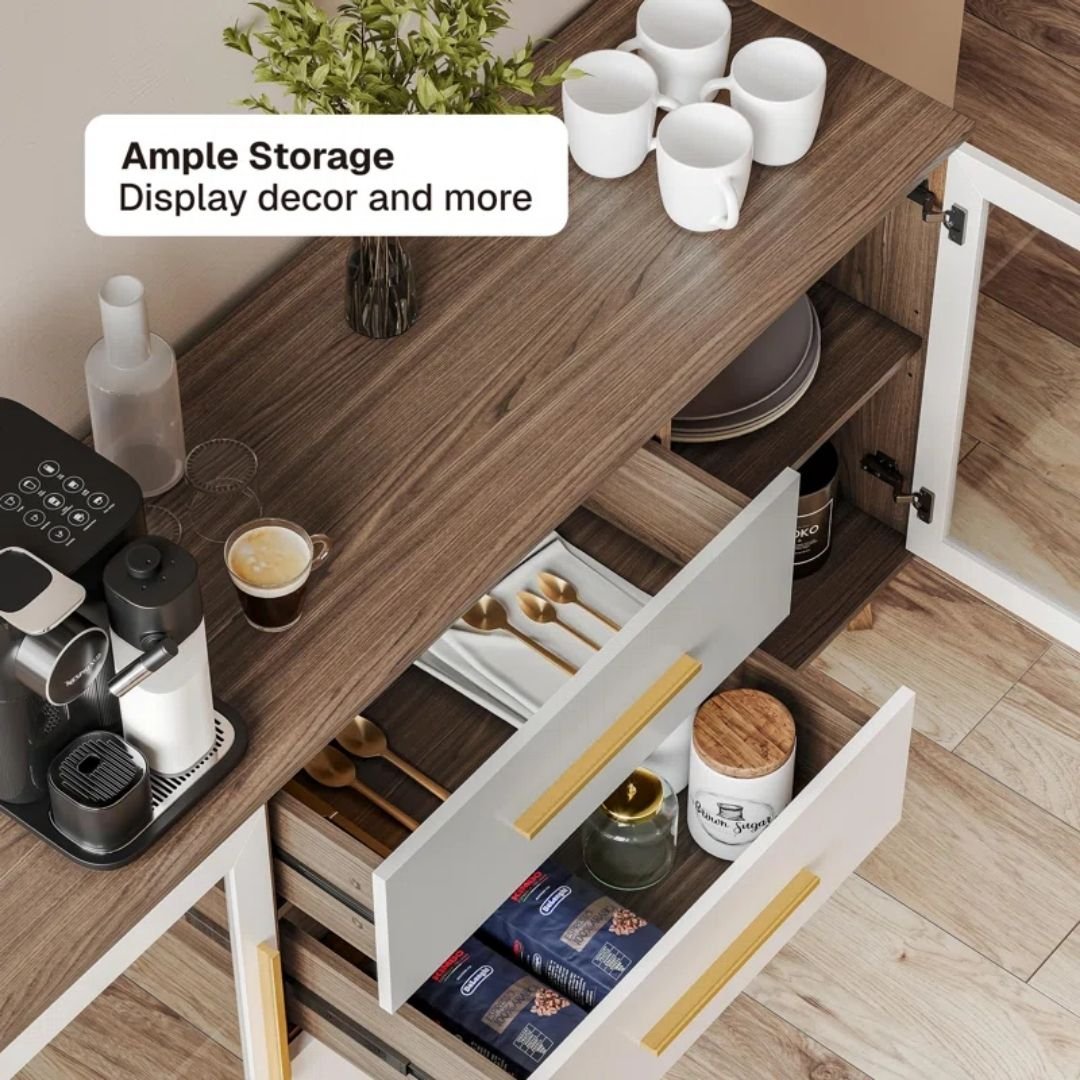 - Spacious Storage – Three pull-out drawers can hold cutlery, fine china, serveware, etc. This glass-door storage buffet has cabinets with adjustable shelves that also double up as display units to show off your heirlooms and favorite accessories.