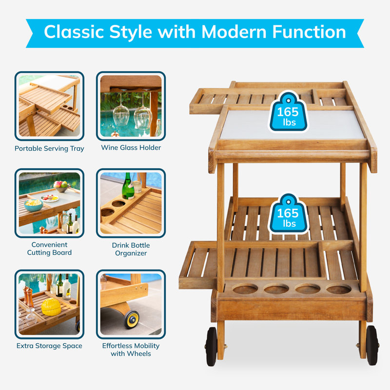 • Multiple shelves designed to hold bottles, glasses, and serving essentials in an organised manner.