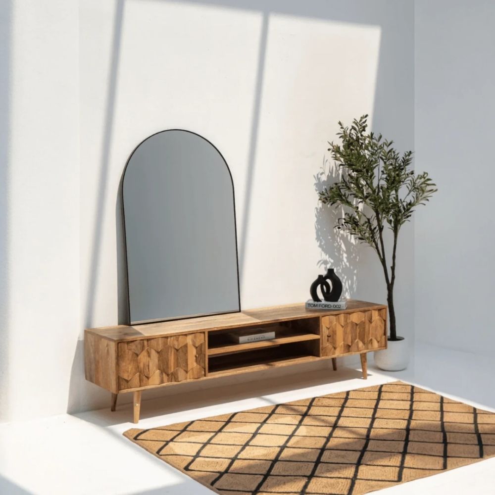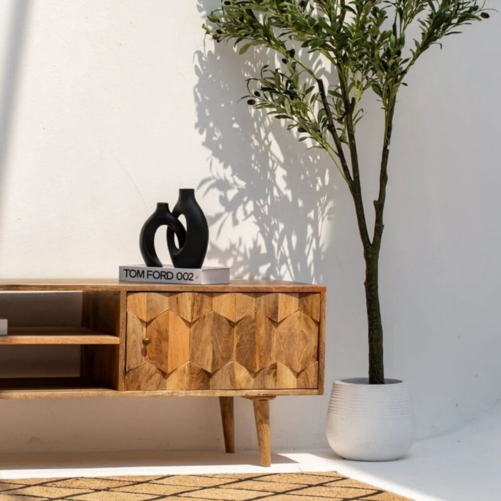 The Nismaaya Manti Teak Wood and Rattan Media Console blends traditional craftsmanship with modern elegance. Made from premium teak wood and detailed with natural rattan, this TV unit brings warmth, texture, and timeless charm to your living room. Its sturdy build and spacious storage make it a perfect choice for Indian homes that value both aesthetics and functionality.