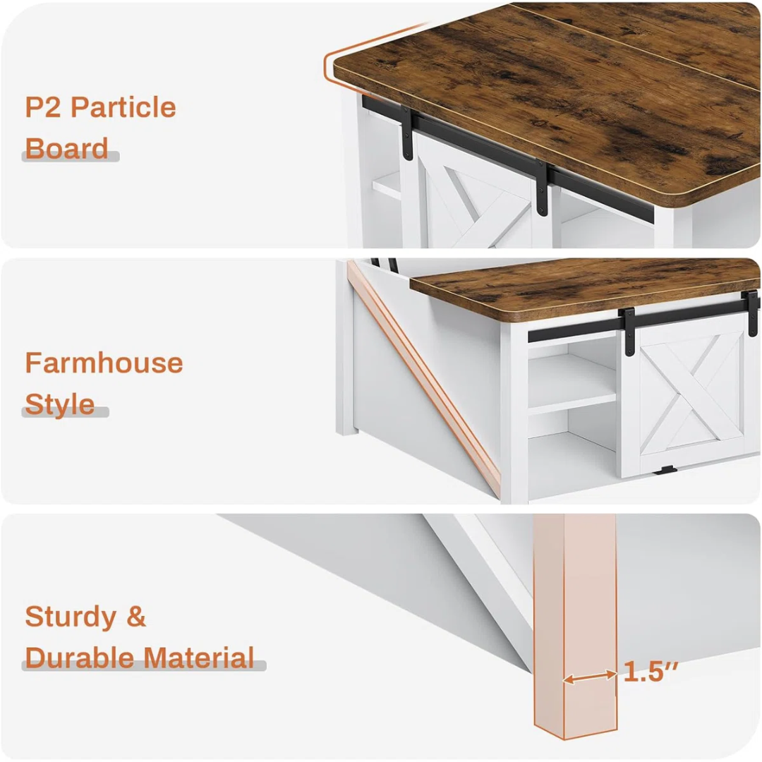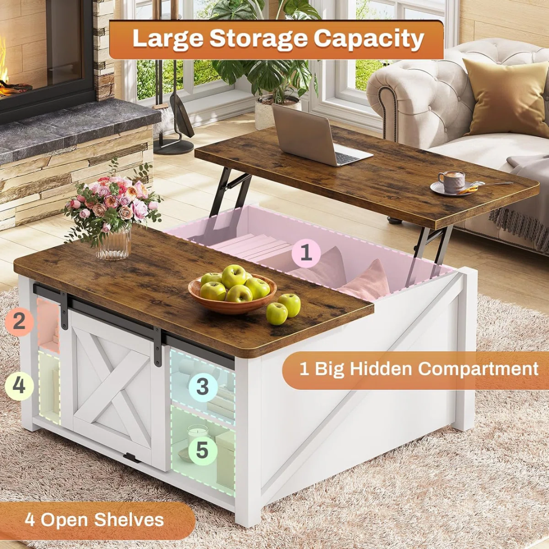 Lift Top Coffee Table, Square Coffee Table with Storage for Living Room, Small Farmhouse Coffee Table with Sliding Barn Door & Storage Shelf