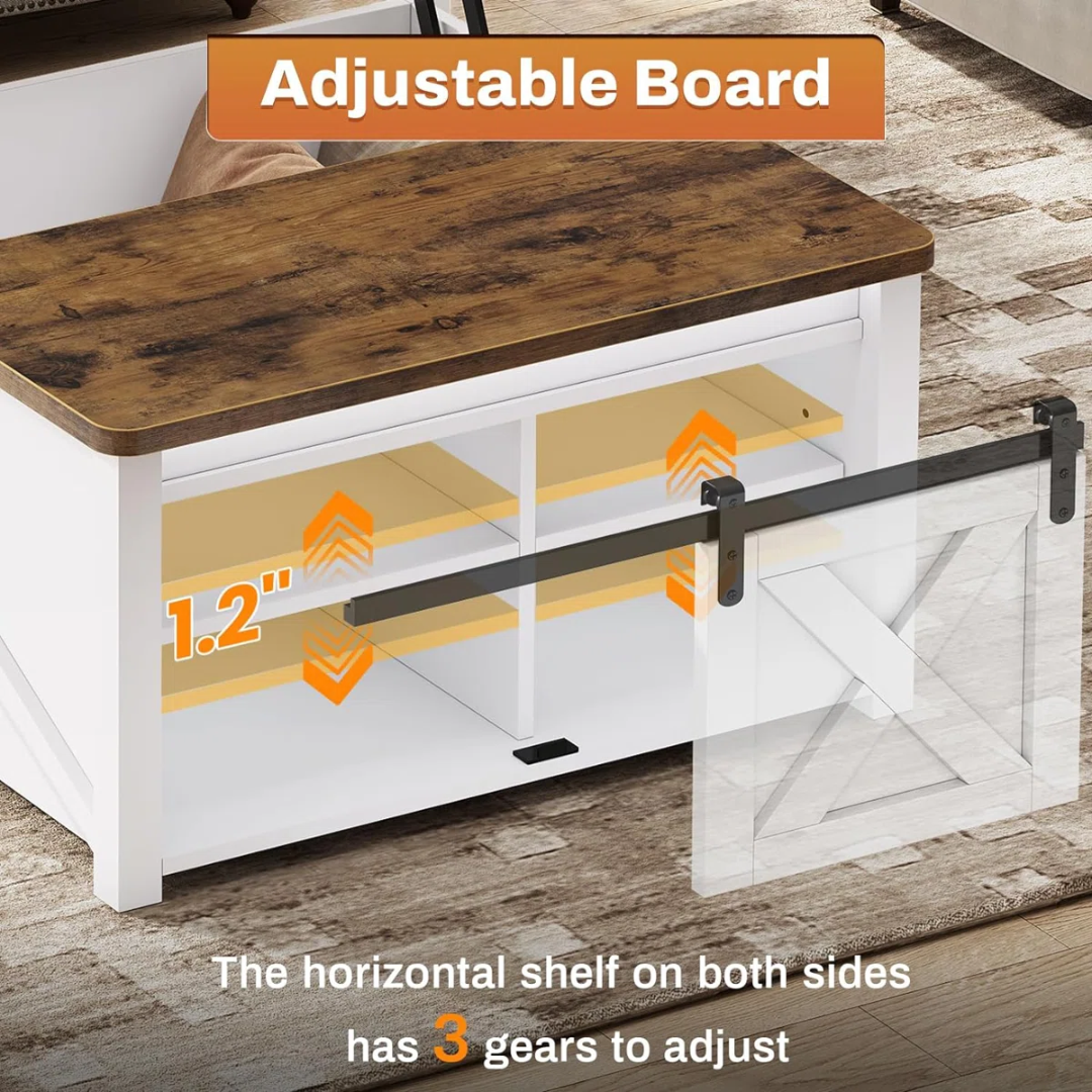 - 【Plenty of Storage】This coffee table with storage comes with big hidden storage compartments, 2 storage cabinets with adjustable shelves, sliding barn doors, and a spacious tabletop. Hidden storage compartments can store some blankets or pillows, and open storage shelves underneath can store board games and kid toys while keeping them away from dust and maintaining a clean and tidy living room. When the lifting function is not used, it can be used for playing some family games.