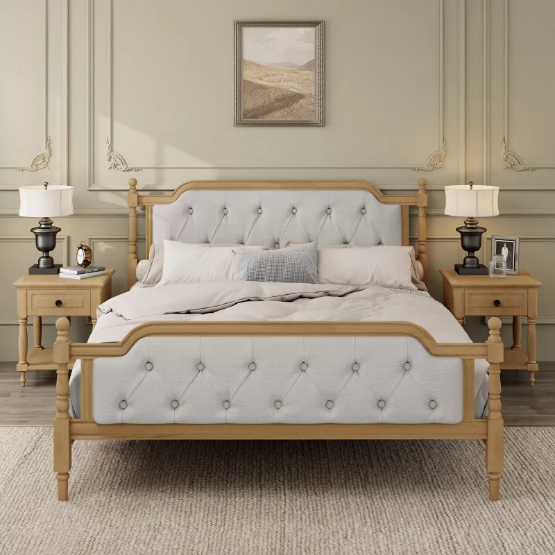 Traditional Style Solid Wood Bed Frame with Upholstered Tufted Headboard
