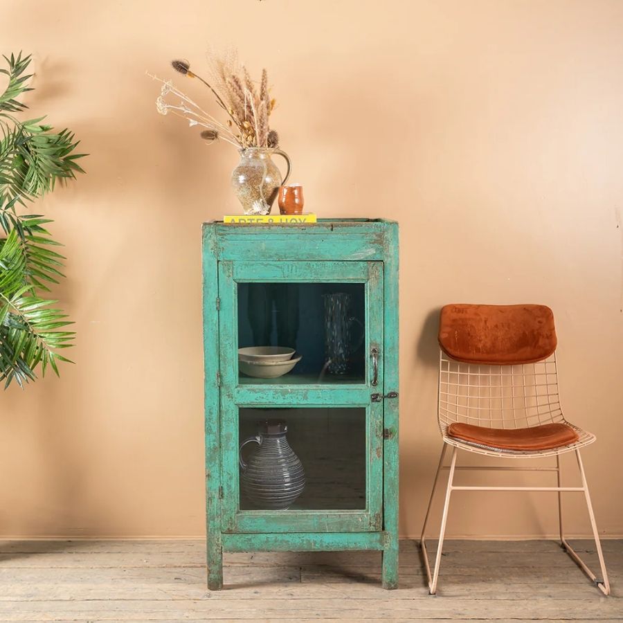 Be the first to review “Turquoise Vintage Wooden Side Cabinet with Glass Door”