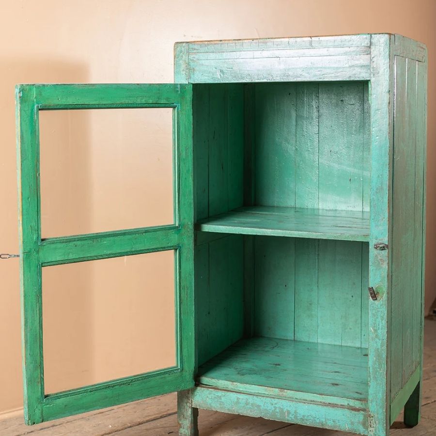 Add soft color and timeless charm to your interior with this beautifully designed Turquoise Vintage Side Cabinet. Crafted from solid wood, this elegant piece features a single glazed door that opens onto a shelved interior, making it perfect for both storage and display.