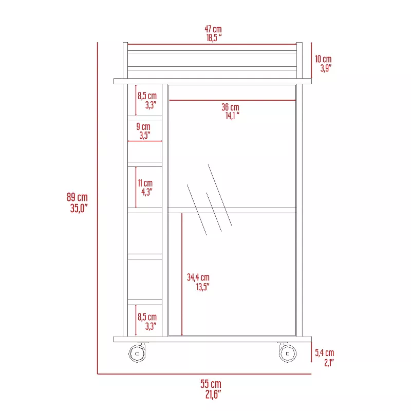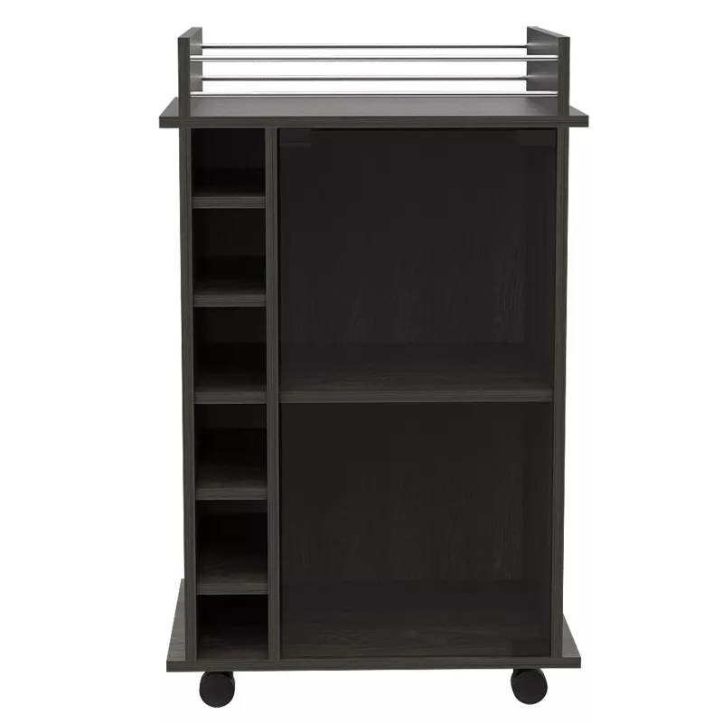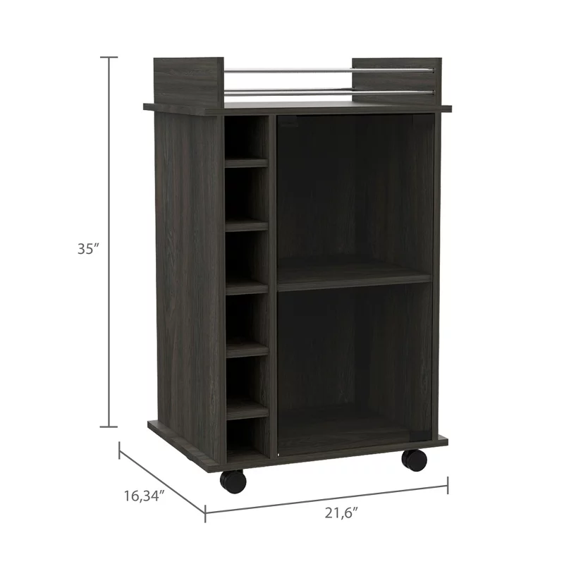 This versatile storage cart with two shelves and a built-in six-bottle rack is a practical and stylish addition to your dining room or living space. Crafted from durable particle board, it offers reliable support and ample storage for bottles, glassware, or everyday essentials. Its compact design makes it ideal for organizing and serving while enhancing your interior with a clean and functional look.