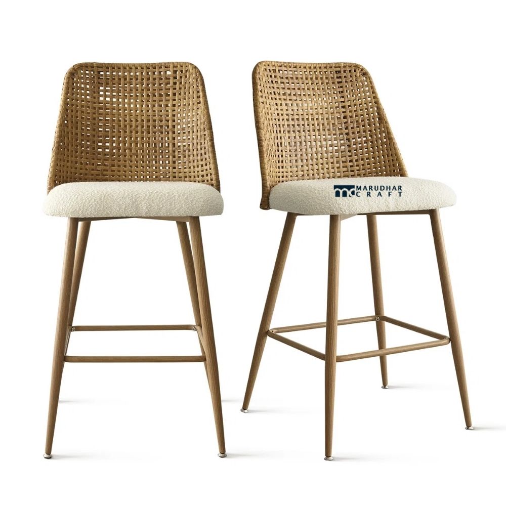 This set of two bar stools is designed to bring comfort and natural elegance to Indian home bars and kitchen counters. Featuring a full back design, these stools offer proper support for relaxed seating. The combination of soft bouclé upholstery and rattan detailing adds texture and visual warmth, making them suitable for modern and contemporary interiors. Built with a sturdy structure, these bar stools are ideal for everyday use while enhancing the overall look of your bar or dining space.