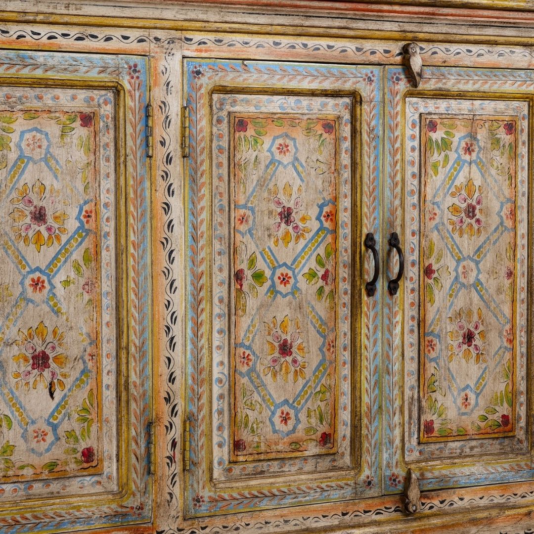 This hand-painted bohemian sideboard is a vibrant statement piece within our vintage furniture collection, crafted from reclaimed wood and infused with Mediterranean artistry. Intricate floral and geometric patterns in warm yellow, turquoise, and earthy tones celebrate traditional craftsmanship, while the distressed antique finish enhances its rustic charm.