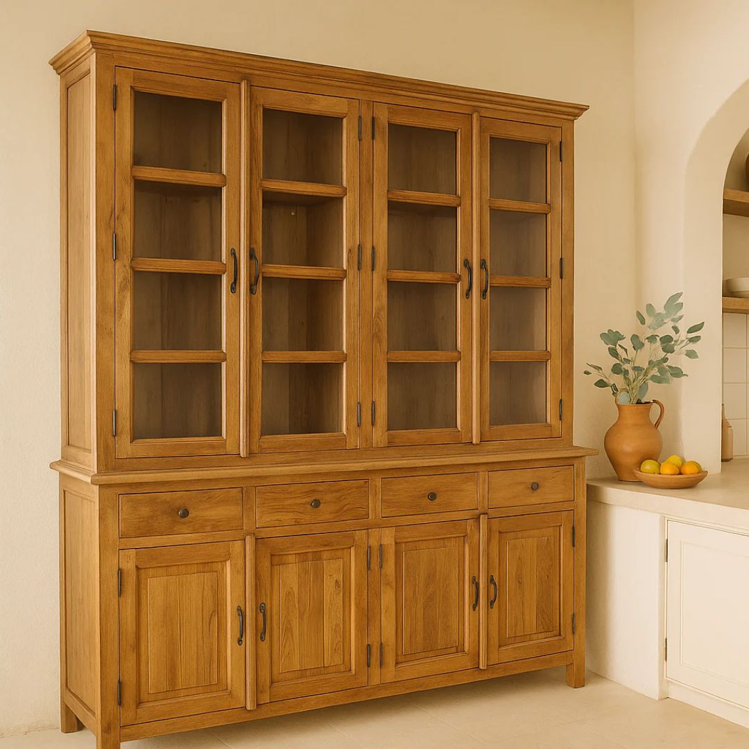 Pranav is a striking two-part showcase cabinet crafted from solid reclaimed teak wood, designed with a focus on natural elegance and functional beauty. Inspired by the rustic ease of Ibiza interiors, it brings quiet sophistication to dining areas, kitchens, or open living spaces.