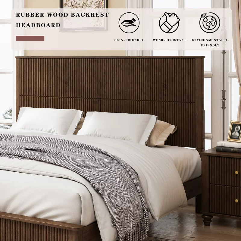 Constructed from durable rubberwood and reinforced plywood, this platform bed offers exceptional strength and stability while supporting heavy weight with ease. The vertical wood grain headboard creates a striking visual focal point, while the platform design eliminates the need for a box spring. Perfect for modern, contemporary, or transitional interiors, this bed frame delivers lasting comfort and sophisticated style for adult bedrooms.
