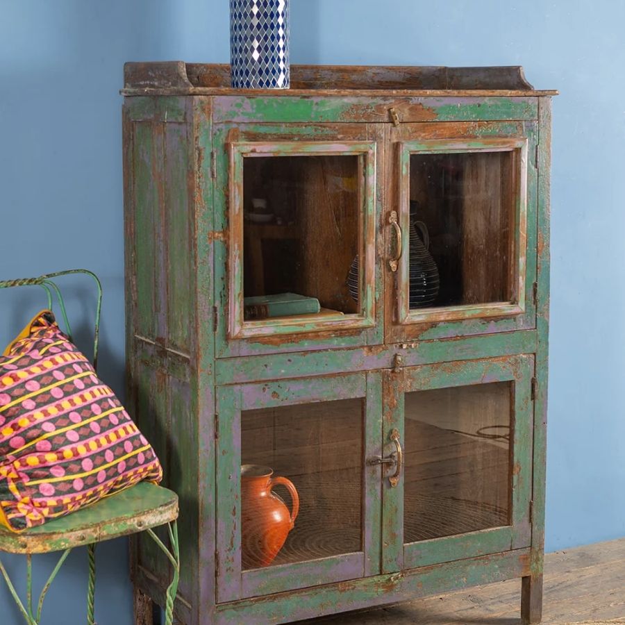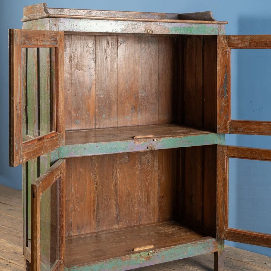 Add colour, character, and timeless appeal to your home with this Vintage Blue, Green & Lilac Cabinet. Crafted from solid wood, this beautiful cabinet features four glazed doors that open onto a spacious interior, making it perfect for displaying your favorite décor, collectibles, and treasured items.