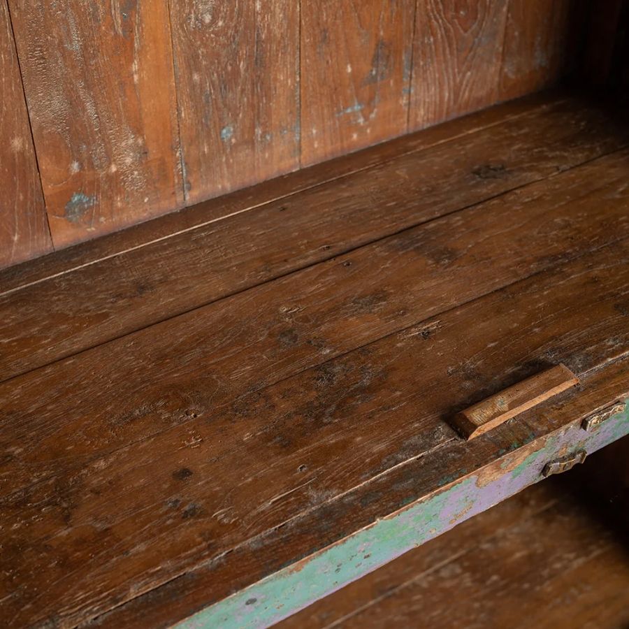 The highly distressed exterior showcases a stunning blend of blue, green, and lilac tones, with hints of natural wood visible beneath, creating a rich, layered vintage look. This vibrant colouration is beautifully balanced by the warm natural wood interior and simple, elegant styling, making this cabinet a charming addition to any room.