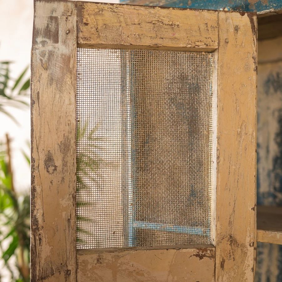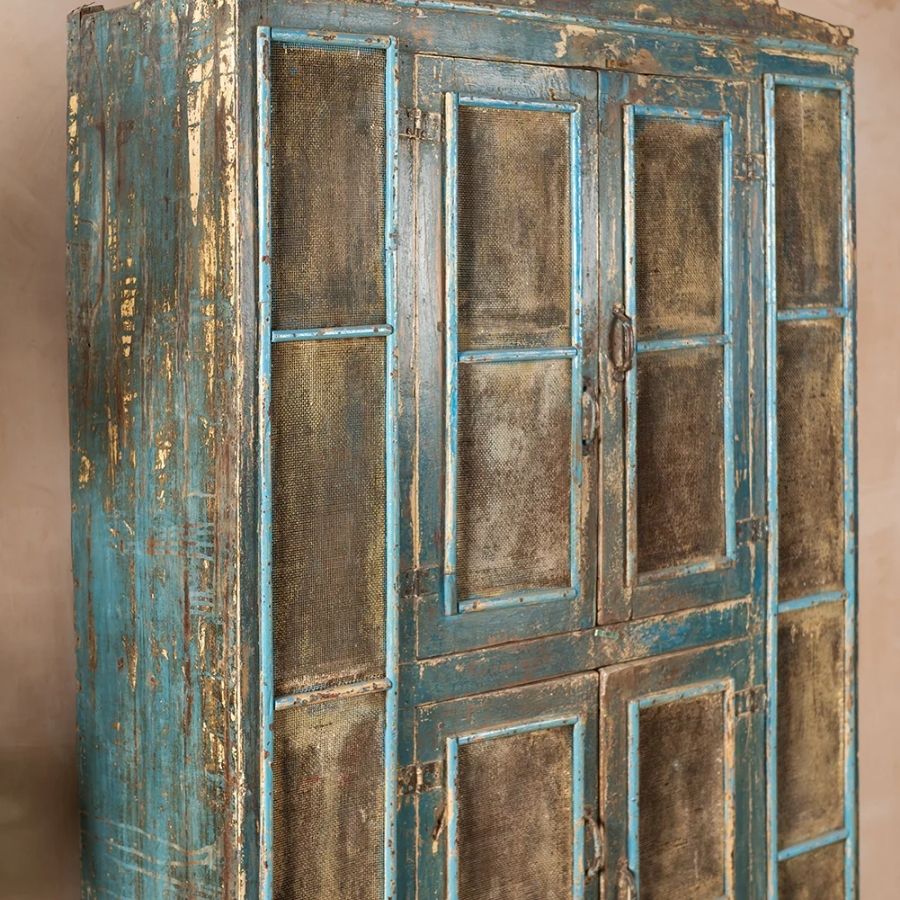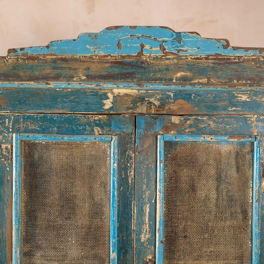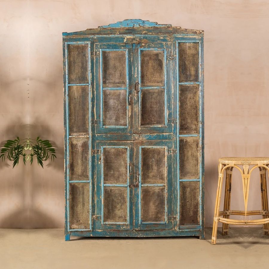 Vintage Blue Jali Wooden Almirah with Metal Mesh Panels