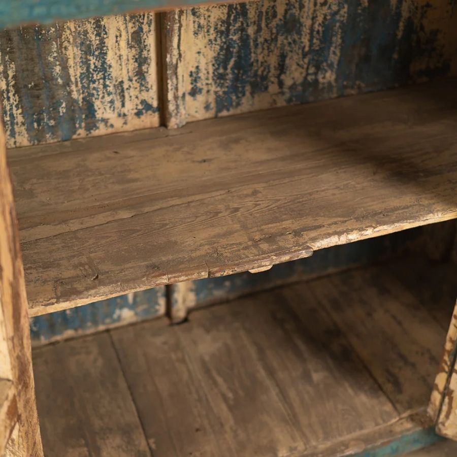 The highly distressed blue exterior creates a striking, aged look that pairs beautifully with the warm cream and natural wood tones of the interior. Finished with a shaped wooden top edge, this almirah offers both refined design and practical storage, making it a stunning addition to any room.