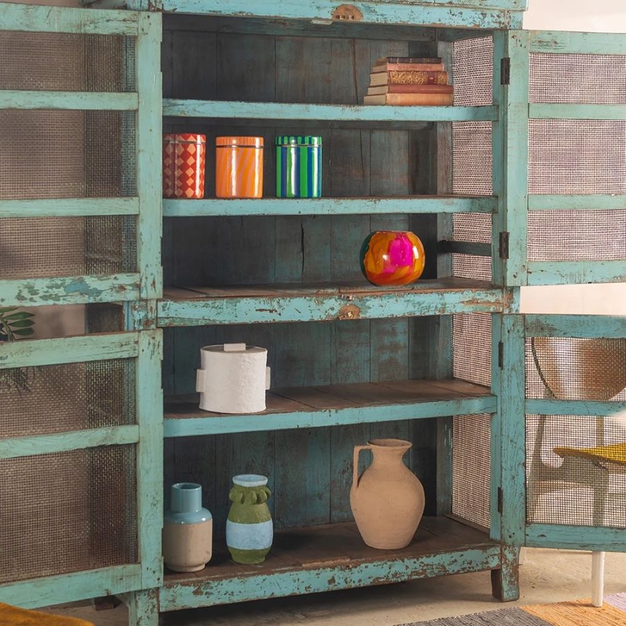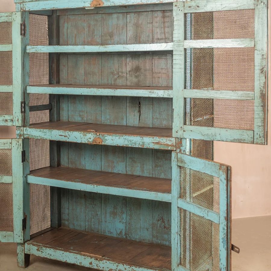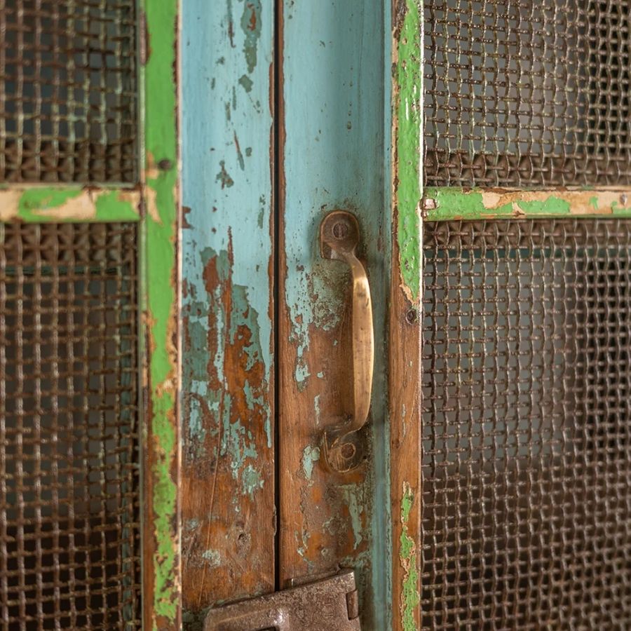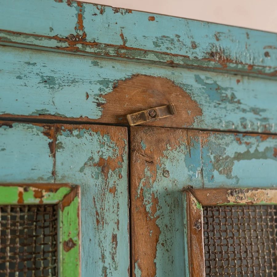 Traditional jali mesh panels on both the doors and side sections add ventilation while enhancing the vintage appeal. The highly distressed exterior showcases a beautiful blend of blue, green, and cream tones, reflecting a lifetime of character and creating a uniquely textured look. Designed to stand out, this cupboard is sure to become a striking focal point in any home.
