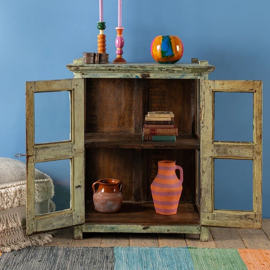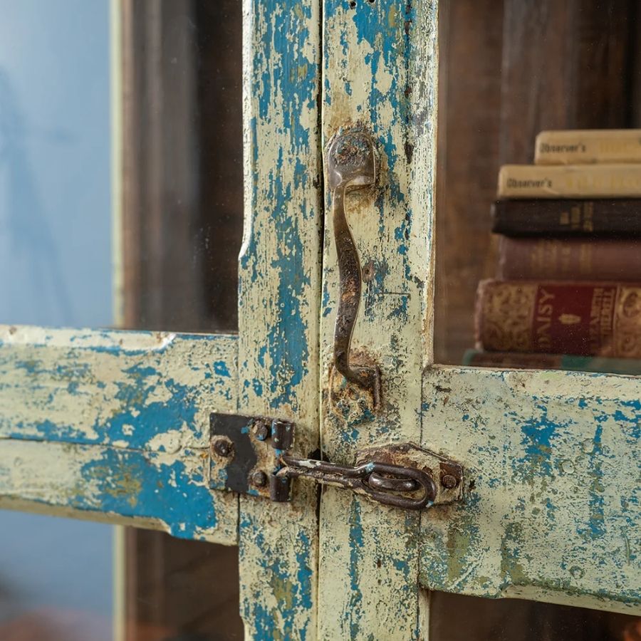 The highly distressed blue and white exterior creates a rich vintage texture, perfectly complemented by the warm natural wood interior shelves. This charming contrast gives the cabinet a distinctive and characterful look, making it a perfect statement piece for your living room, dining area, or hallway.