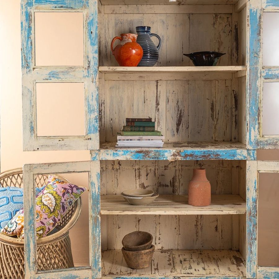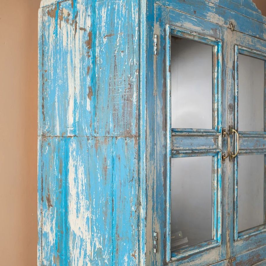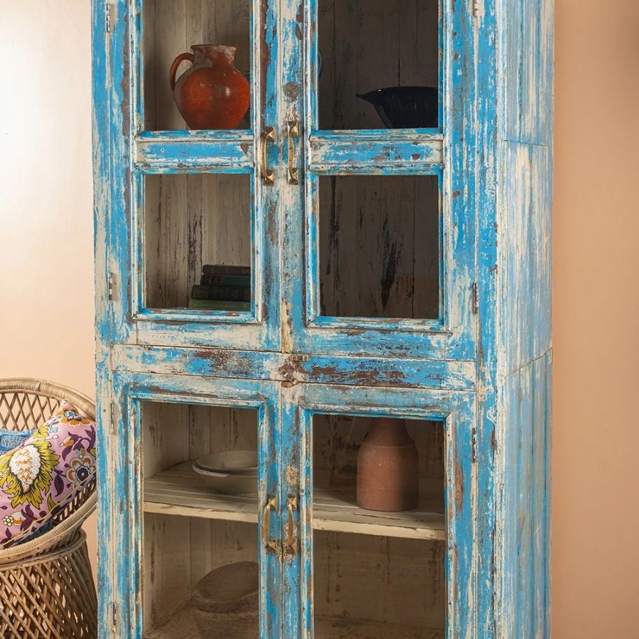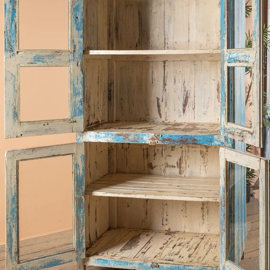 Add timeless charm and relaxed elegance to your home with this Vintage Blue Glazed Cabinet. Crafted from wood, this tall and striking cabinet features four glazed doors that open onto a cream-coloured shelved interior, offering generous space for both beautiful display and practical storage.