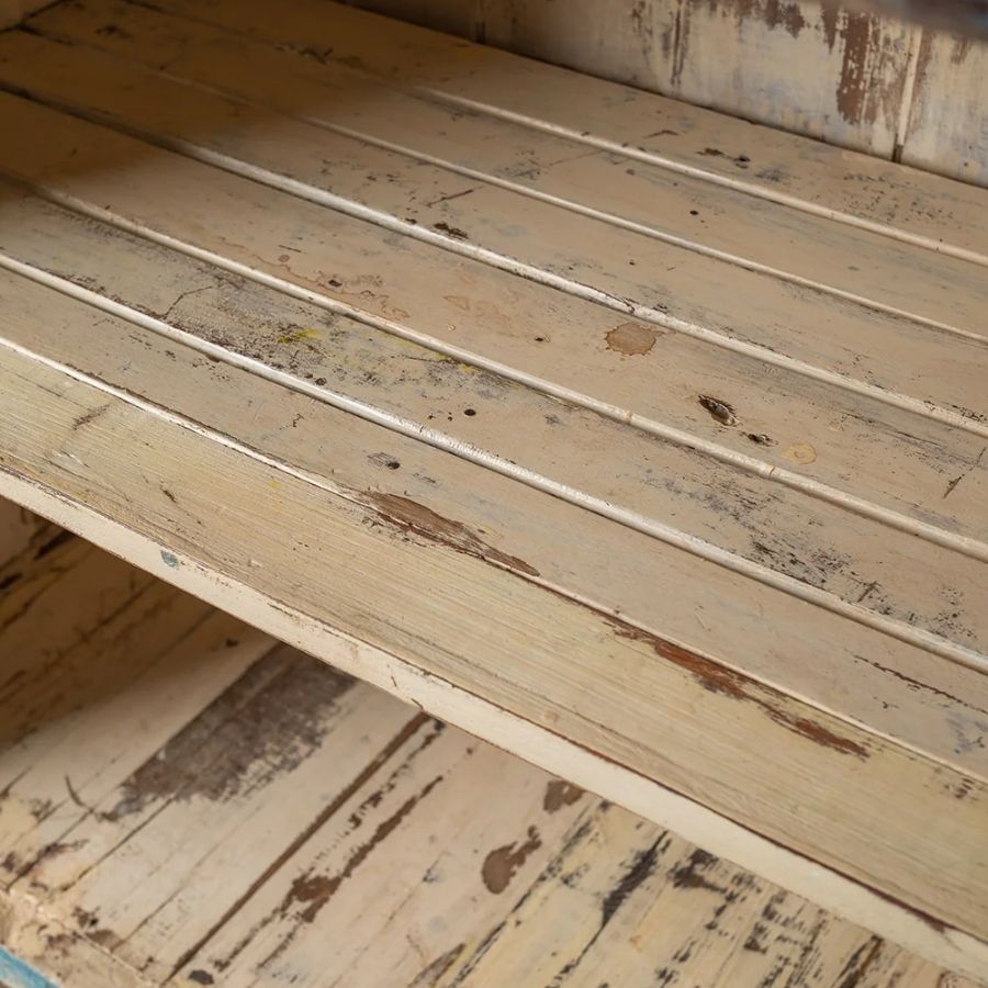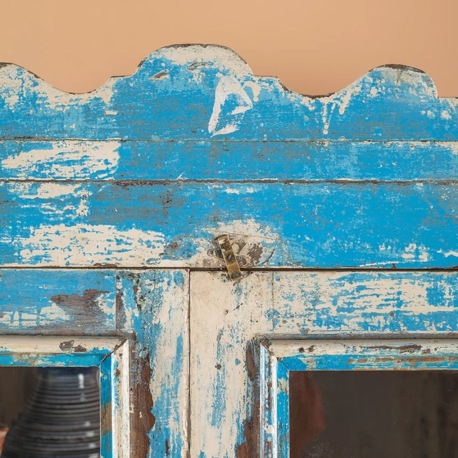 The highly distressed blue exterior paintwork creates a warm, characterful look that feels inviting and easy-going. Finished with a shaped wooden top edge and metal fixings, this cabinet blends classic vintage styling with functional design, making it a perfect addition to a kitchen, dining room, or living space.