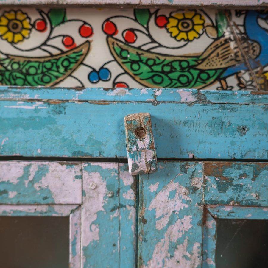 The highly distressed blue and white exterior paintwork blends effortlessly with the rich green interior, creating a wonderfully layered and aged look. A stunning hand-painted panel of birds and foliage, protected by glass, adds an artistic and decorative focal point, making this sideboard a truly unique piece for a living room or dining area.