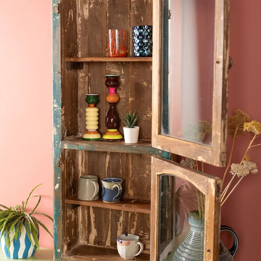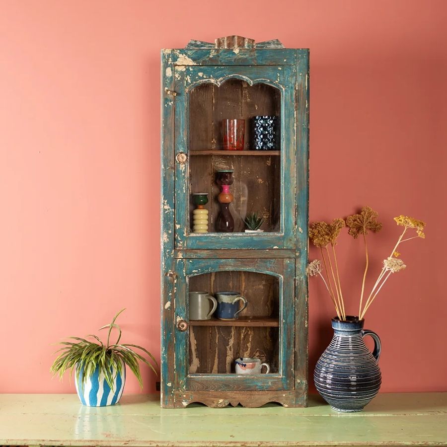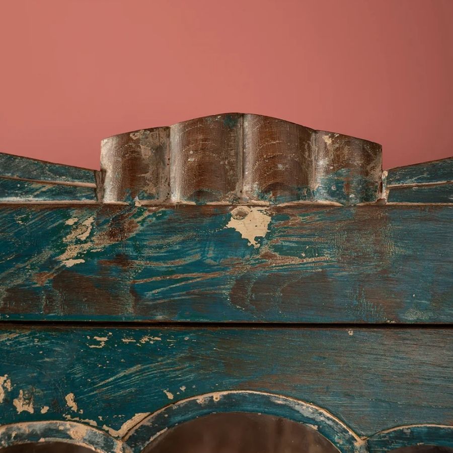 The beautifully distressed dark blue exterior contrasts gracefully with the natural wood interior, creating a rich and characterful vintage appeal. Finished with delicately carved and shaped wooden details, this showcase looks equally stunning when wall-mounted or placed as a standing display unit. A perfect blend of functionality and classic design, it enhances both traditional and modern interiors.