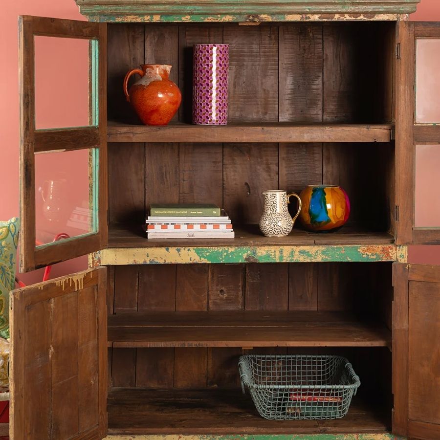 The traditional styling is perfectly complemented by the rich natural wood interior, adding warmth and depth to the overall look. Finished in a highly distressed green and cream paintwork, the exterior has a textured, ever-changing surface that gives this cabinet exceptional character and timeless vintage charm.