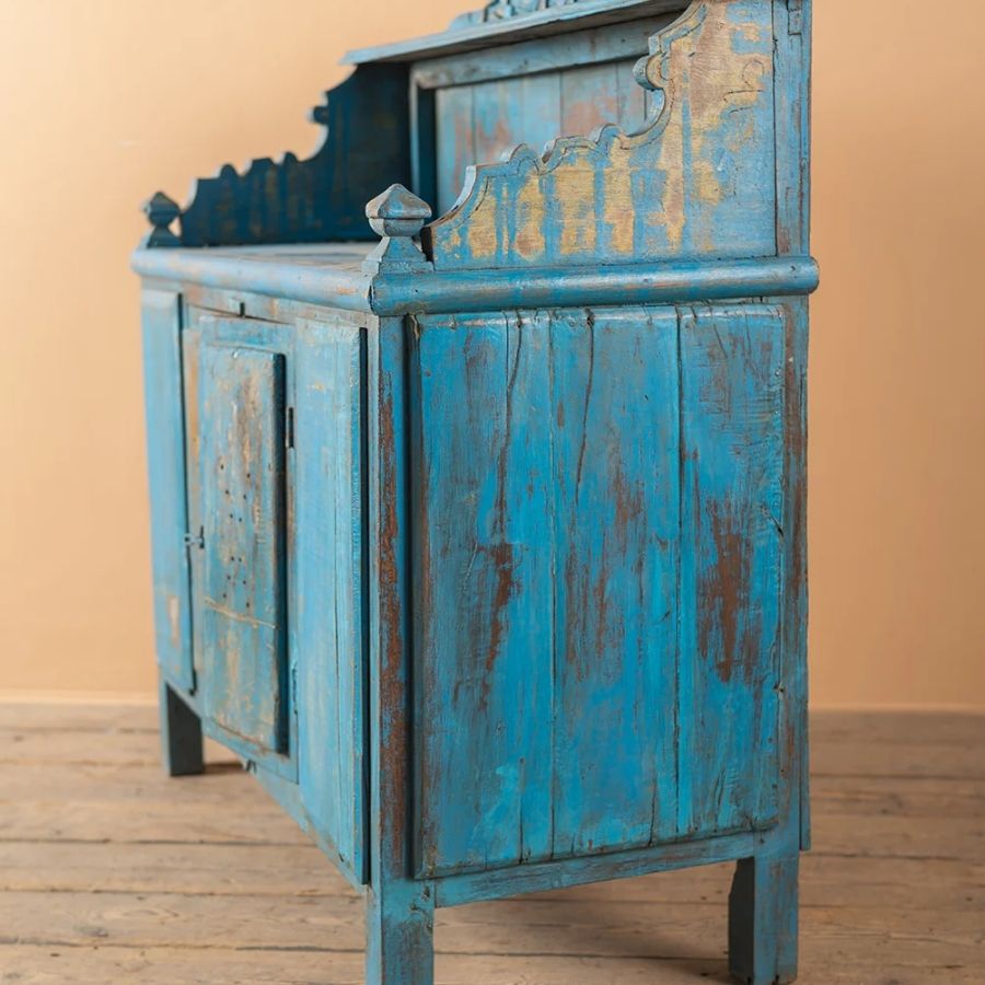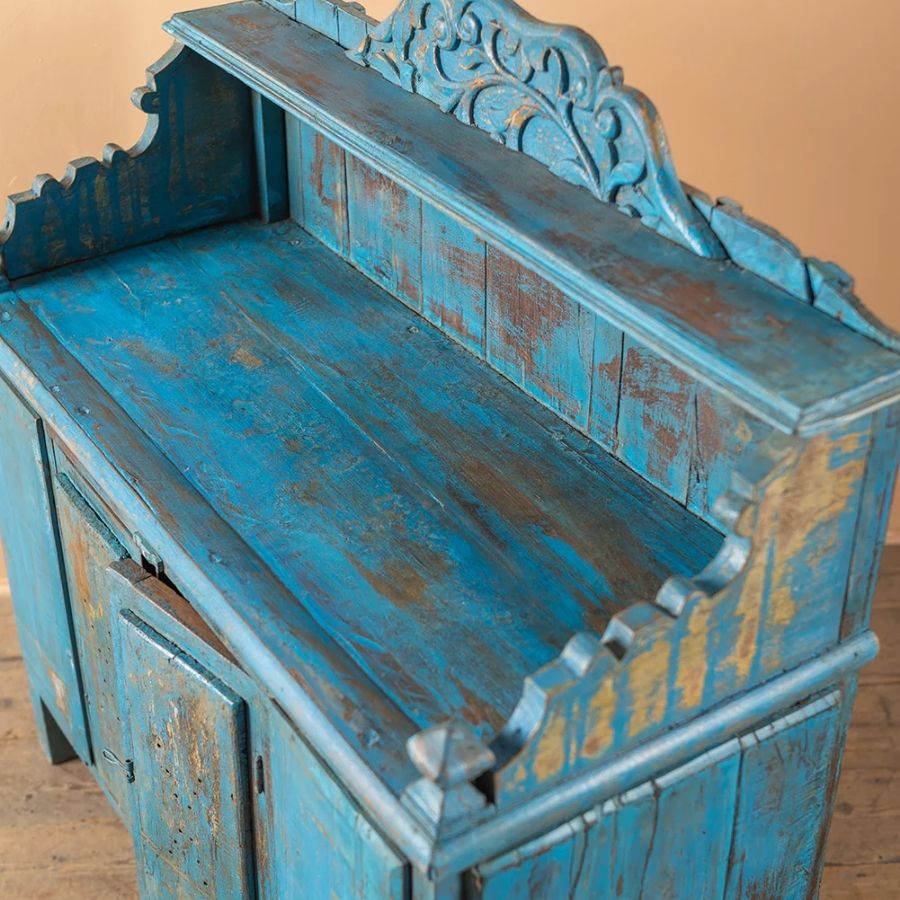 Two small front doors open to a spacious cupboard interior, providing ample storage for household essentials. The top is framed with a gorgeous shaped edge featuring carved designs, along with a set-back shelf that offers additional space for decorative display or everyday storage. The highly distressed light blue finish contrasts beautifully with the warm natural wood interior, creating a soft yet characterful look. Ideal for bedrooms, guest rooms, hallways, or landings.