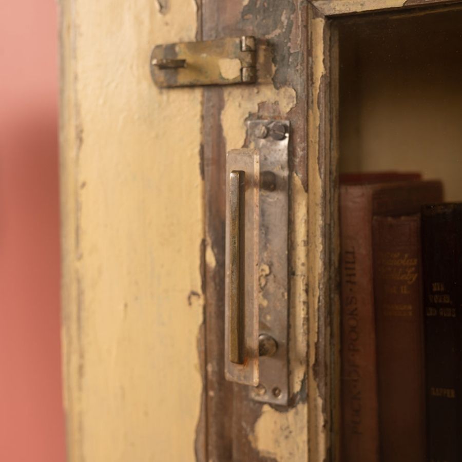The single glazed door opens to a shallow yet spacious shelved interior, perfect for displaying decorative treasures, collectibles, and personal keepsakes. Finished in a distressed buttermilk yellow tone inside and out, this cabinet offers a soft, neutral look that blends effortlessly with a wide range of interior styles while adding a touch of vintage character.
