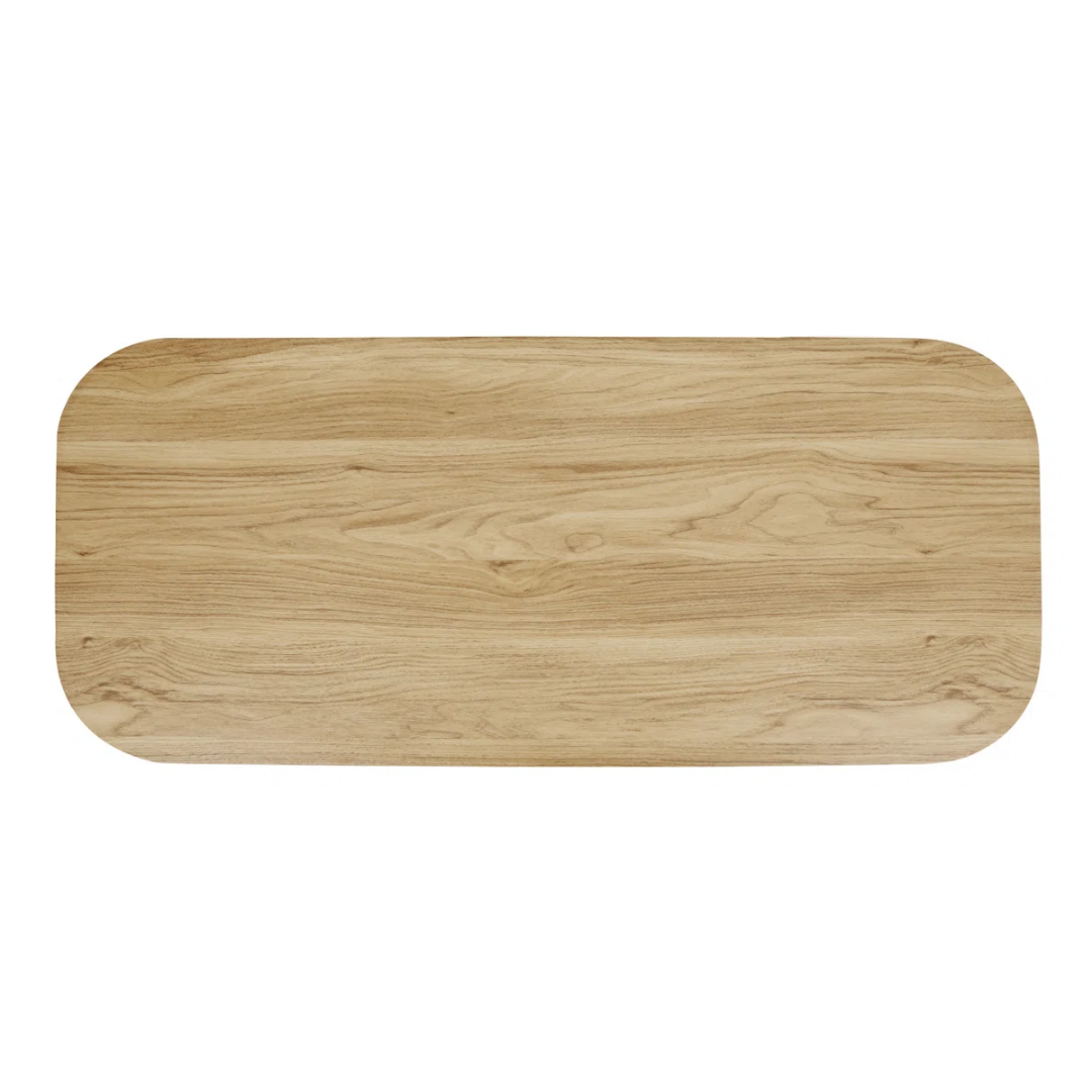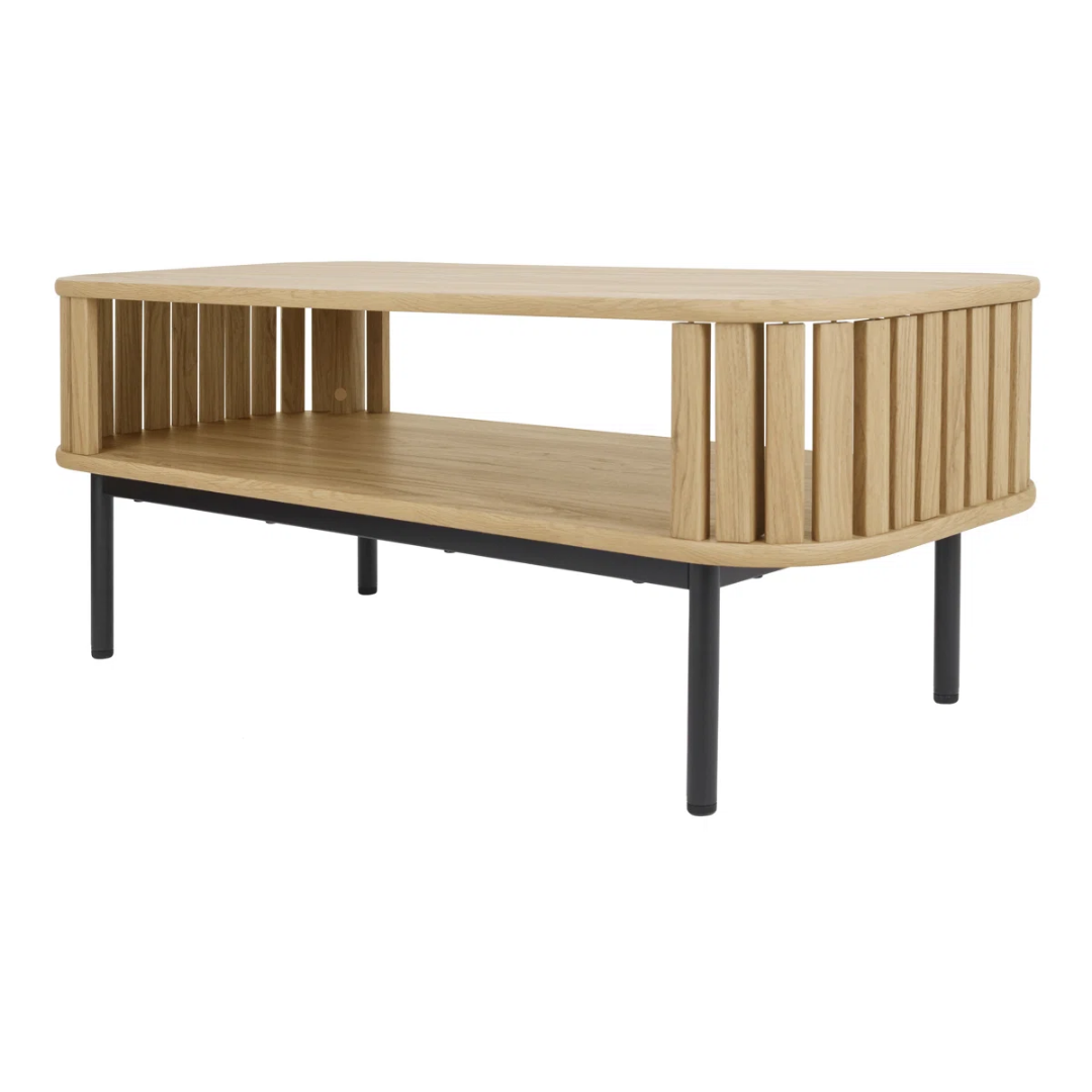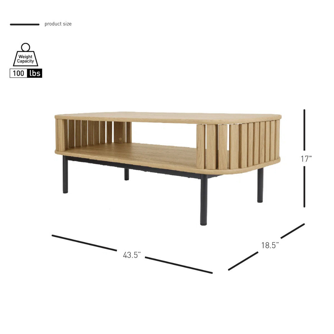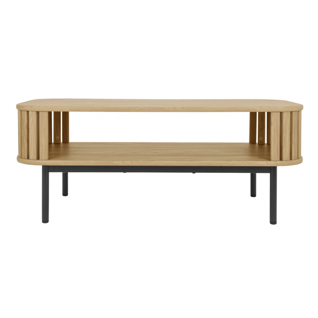 Featuring a modern aesthetic and plenty of mid-century flair, this coffee table incorporates tambour cabinetry by highlighting its rounded curves and horizontally arranged slats for the side frame. Four sleek black steel legs help support the upper section that’s crafted from engineered wood with a warm oak finish. This table comes with an open lower shelf to keep board games and books handy, while the table top is plenty spacious enough for magazines, remotes, and decor.
