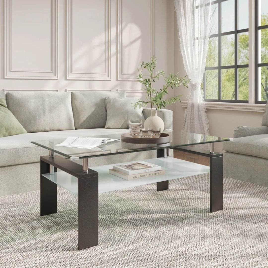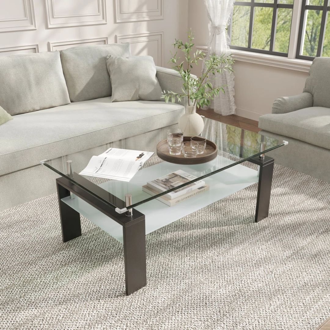 - Double Storage: Upper 40 “L x 23 “W, large enough for you to put your daily necessities, such as teapot, vase, fruit plate, etc.; Lower can be used for books and magazines and other infrequently used sundries. The coffee table has a simple exterior design and a clean and smooth glass surface. It is beautiful and practical to put in your living room.