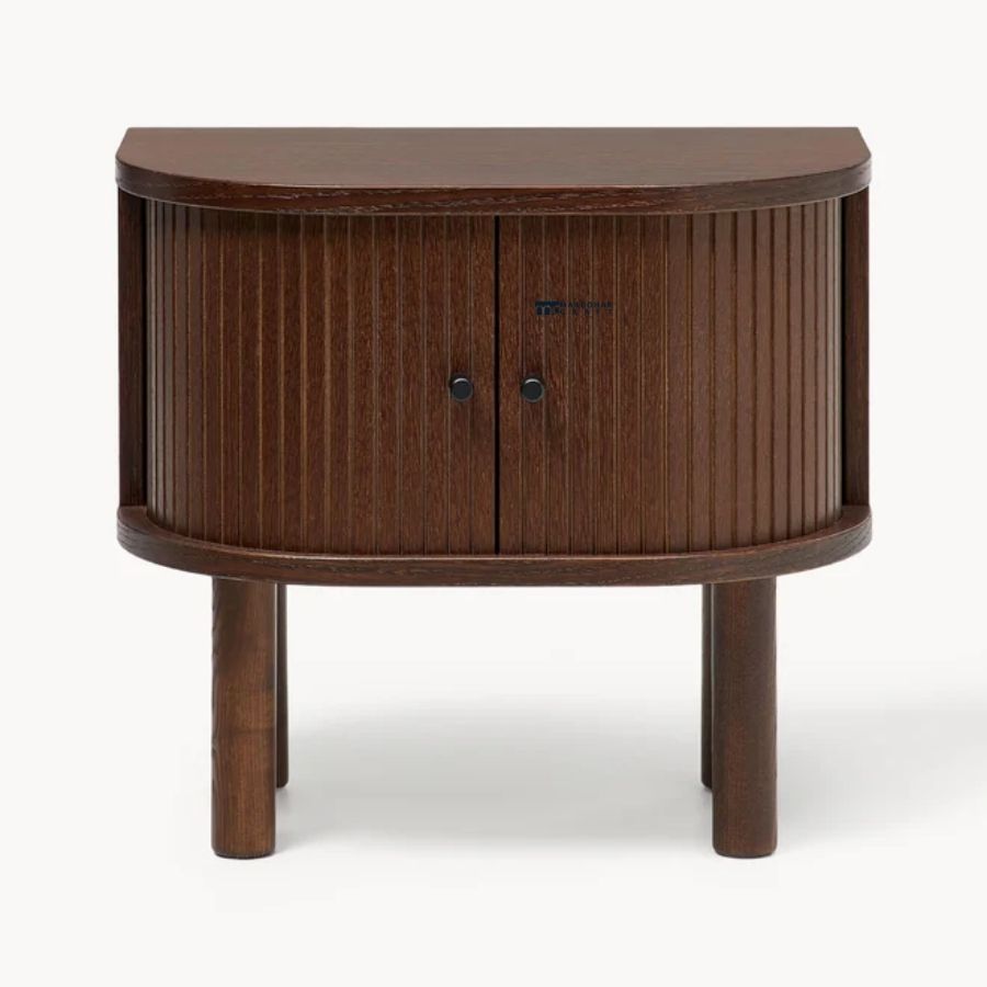 Infuse your bedroom with the warmth of mid-century charm with this walnut-finished nightstand. Its unique pill-shaped silhouette features elegant tambour sliding doors that glide effortlessly to reveal a spacious interior. The rich wood grain is paired with minimalist round legs, offering a timeless aesthetic that bridges the gap between classic vintage and modern organic design.