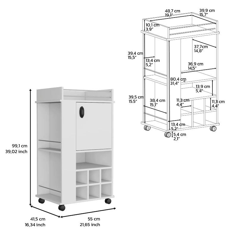 This wine storage cart with six built-in bottle slots offers a practical and stylish solution for organizing and serving your favorite beverages. Crafted from durable particle board, it provides a sturdy structure with a compact footprint. Designed with smooth-rolling caster wheels, the cart allows easy mobility while keeping bottles and essentials within reach. Ideal for dining rooms, living areas, or home bars, it combines functionality with modern design.