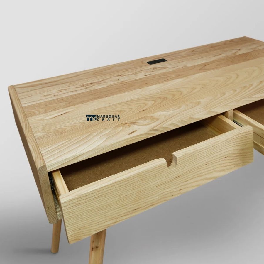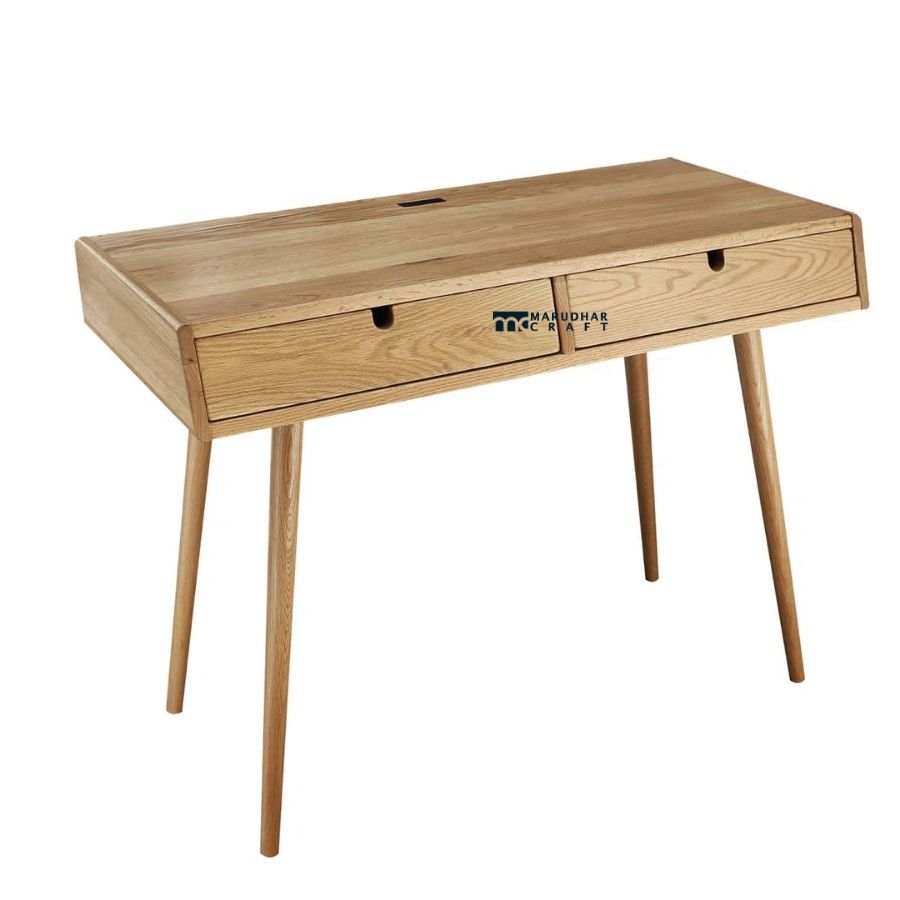 This solid wood study table features a sleek Scandinavian-inspired design that blends simplicity with functionality. Crafted with a natural wood finish and angled legs, the desk adds warmth and elegance to modern interiors. The spacious tabletop is ideal for laptop work, writing, or creative tasks, while the wide built-in drawer provides concealed storage for stationery and daily essentials. Perfect for home offices, bedrooms, or compact workspaces, this desk offers durability with a clean, contemporary look.