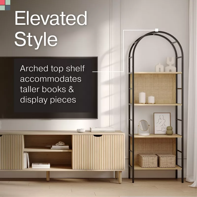 Wooden 4-Tier Rattan Arched Bookshelf – Decorative Bookcase with Metal Frame