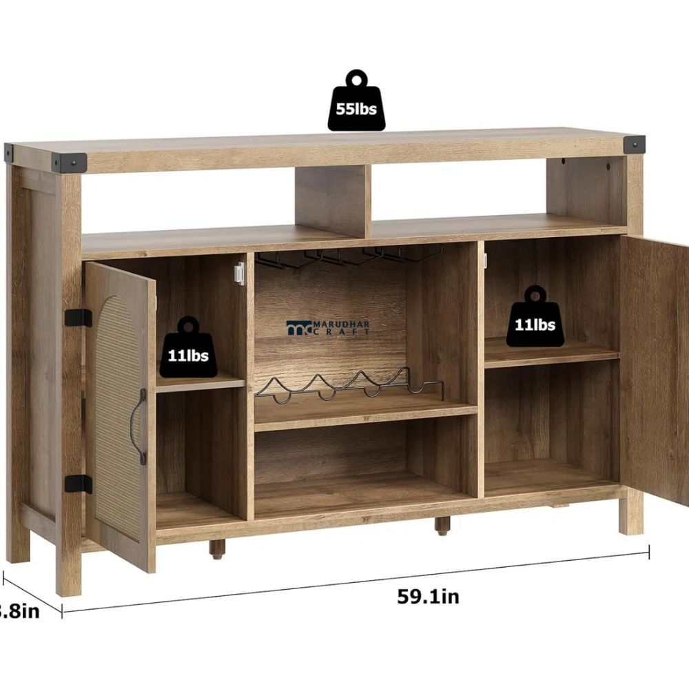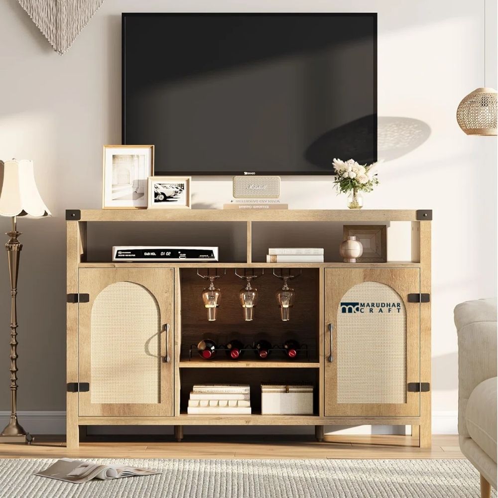 This wooden rattan bar cabinet is thoughtfully designed to bring natural texture and functional storage into Indian homes. Crafted from sturdy wood and detailed with woven rattan panels, it adds a warm, contemporary touch to living or dining spaces. The built-in 9-grid wine rack allows organized storage of wine bottles, while the cabinet space offers room for bar accessories and glassware. Ideal for home bars and entertaining areas, this piece blends style, utility, and durability with ease.