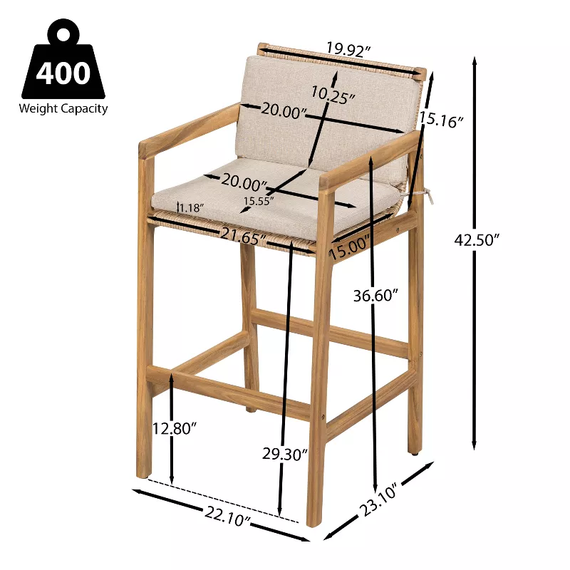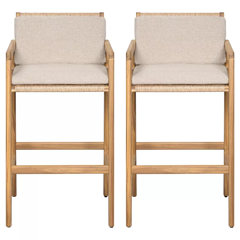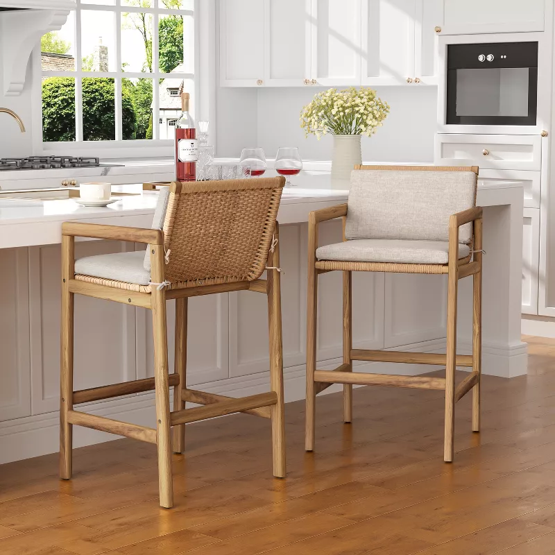 Woven Acacia Wood Bar Stools with Cushions – Set of 2, Durable & Stylish Design